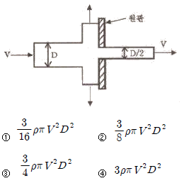 24. 그림과 같이 중앙부분에 구멍이 뚫린 원판에 지름 D의 원형 물제트가 대기압 상태에서 V의 속도로 충돌하여, 원판 뒤로 지름 D/2의 원형 물제트가 V의 속도로 흘러나가고 있을 때, 이 원판이 받는 힘은 얼마인가? (단, ρ는 물의 밀도이다.)