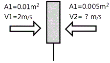 24. 그림과 같이 수직 평판에 속도 2m/s로 단면적이 0.01m2인 물제트가 수직으로 세워진 벽면에 충돌하고 있다. 벽면의 오른쪽에서 물제트를 왼쪽 방향으로 쏘아 벽면의 평형을 이루게 하려면 물제트의 속도를 약 몇 m/s로 해야 하는가? (단, 오른쪽에서 쏘는 물제트의 단면적은 0.005 m2이다.)