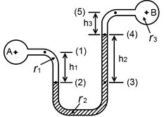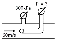 21. 유속 6m/s로 정상류의 물이 화살표 방향으로 흐르는 배관에 압력계와 피토계가 설치되어 있다. 이때 압력계의 계기압력이 300kPa 이었다면 피토계의 계기압력은 약 몇 kPa인가?