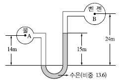 22. 펌프의 입구에서 진공계의 계기압력은 –160mmHg, 출구에서 압력계의 계기압력은 300kPa, 송출 유량은 10m3/min일 때 펌프의 수동력(kW)은? (단, 진공계와 압력계 사이의 수직거리는 2m이고, 흡입관과 송출관의 직경은 같으며, 손실은 무시한다)