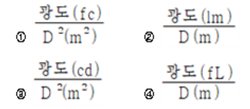 27. 점광원(point source)에서 표면에 비추는 조도(lux)의 크기를 나타내는 식으로 옳은 것은? (단, D는 광원으로부터의 거리를 말한다.)