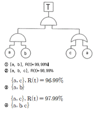 23. 다음 FTA 그림에서 a, b, c의 부품고장률이 각각 0.01일 때, 최소 컷셋(minimal cut sets)과 신뢰도로 옳은 것은?