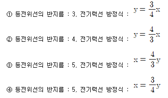4. 전위함수 V=x2+y2(V)일 때 점 (3, 4)(m)에서의 등전위선의 반지름은 몇 m이며, 전기력선 방정식은 어떻게 되는가?