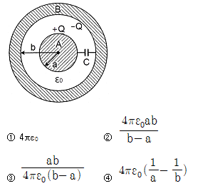 11. 그림과 같이 내부 도체구 A에 +Q(C), 외부 도체구 B에 –Q(C)를 부여한 동심 도체구 사이의 정전용량 C(F)는?