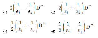 8. 유전율이 ε1, ε2(F/m)인 유전체 경계면에 단위 면적당 작용하는 힘의 크기는 몇 N/m2인가? (단, 전계가 경계면에 수직인 경우이며, 두 유전체에서의 전속밀도는 D1=D2=D(C/m2)이다.)