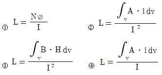 17. 자기유도계수 L의 계산 방법이 아닌 것은? (단, N : 권수, ø : 자속(Wb), I : 전류(A), A : 벡터퍼텐셜(Wb/m), i : 전류밀도(A/m2), B(Wb/m2), H : 자계의 세기(AT/m)이다.