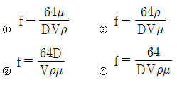 29. 원관 속의 흐름에서 관의 직경, 유체의 속도, 유체의 밀도, 유체의 점성계수가 각각 D, V, ρ, μ로 표시될 때 층류 흐름의 마찰계수(f)는 어떻게 표현될 수 있는가?