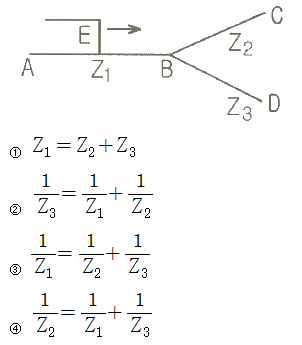 23. 임피던스 Z1, Z2 및 Z3을 그림과 같이 접속한 선로의 A쪽에서 전압과 E가 진행해 왔을 때 접속점 B에서 무반사로 되기 위한 조건은?