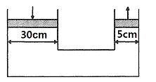 27. 그림에서 두 피스톤의 지름이 각각 30㎝와 5㎝이다. 큰 피스톤이 1㎝ 아래로 움직이면 작은 피스톤은 위로 몇 ㎝ 움직이는가?