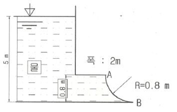 23. 그림과 같이 반지름이 0.8m이고 폭이2m인 곡면 AB가 수문으로 이용된다. 물에 의한 힘의 수평성분의 크기는 약 몇 kN인가? (단, 수문의 폭은 2m 이다.)