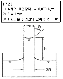 25. 그림과 같이 매끄러운 유리관에 물이 채워져 있을 때 모세관 상승높이 h는 약 몇 m인가?