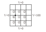 20. 그림과 같은 정방형관 단면의 격자점 ⑥의 전위를 반복법으로 구하면 약 몇 V 인가?