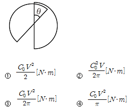 2. 최대 정전용량 C0[F]인 그림과 같은 콘덴서의 정전용량이 각도에 비례하여 변화한다고 한다. 이 콘덴서를 전압 V[V]로 충전하였을 때 회전자에 작용하는 토크는?