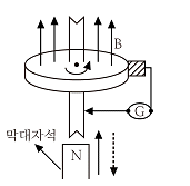 10. 막대자석 위쪽에 동축 도체 원판을 놓고 회로의 한 끝은 원판의 주변에 접촉시켜 회전하도록 해 놓은 그림과 같은 패러데이 원판 실험을 할 때 검류계에 전류가 흐르지 않는 경우는?