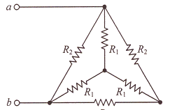 회로에서 a, b 간의 합성저항(Ω)은? (단, R1=3Ω, R2=9Ω이다.
