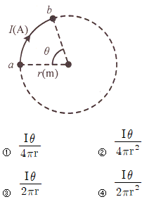 그림과 같이 반지름 r(m)인 원의 원주상 임의의 2점 a, b 사이에 전류 I(A)가 흐른다. 원의 중심에서의 자계의 세기는 몇 A/m인가??