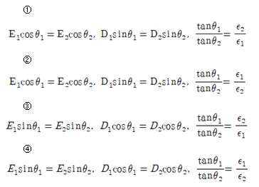 두 종류의 유전율(ɛ1, ɛ2)을 가진 유전체가 서로 접하고 있는 경계면에 진전하가 존재하지 않을 때 성립하는 경계조건으로 옳은 것은? (단, E1, E2는 각 유전체에서의 전계이고, D1, D2는 각 유전체에서의 전속밀도이고, θ1, θ2는 각각 경계면의 법선벡터와 E1, E2가 이루는 각이다.)